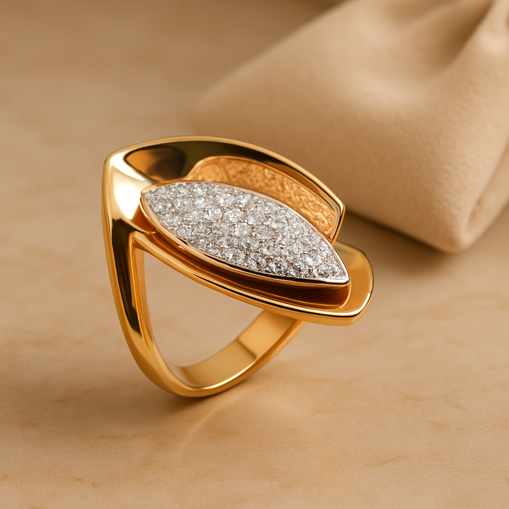 Goldener Diamantring mit funkelnden blattförmigen Elementen.