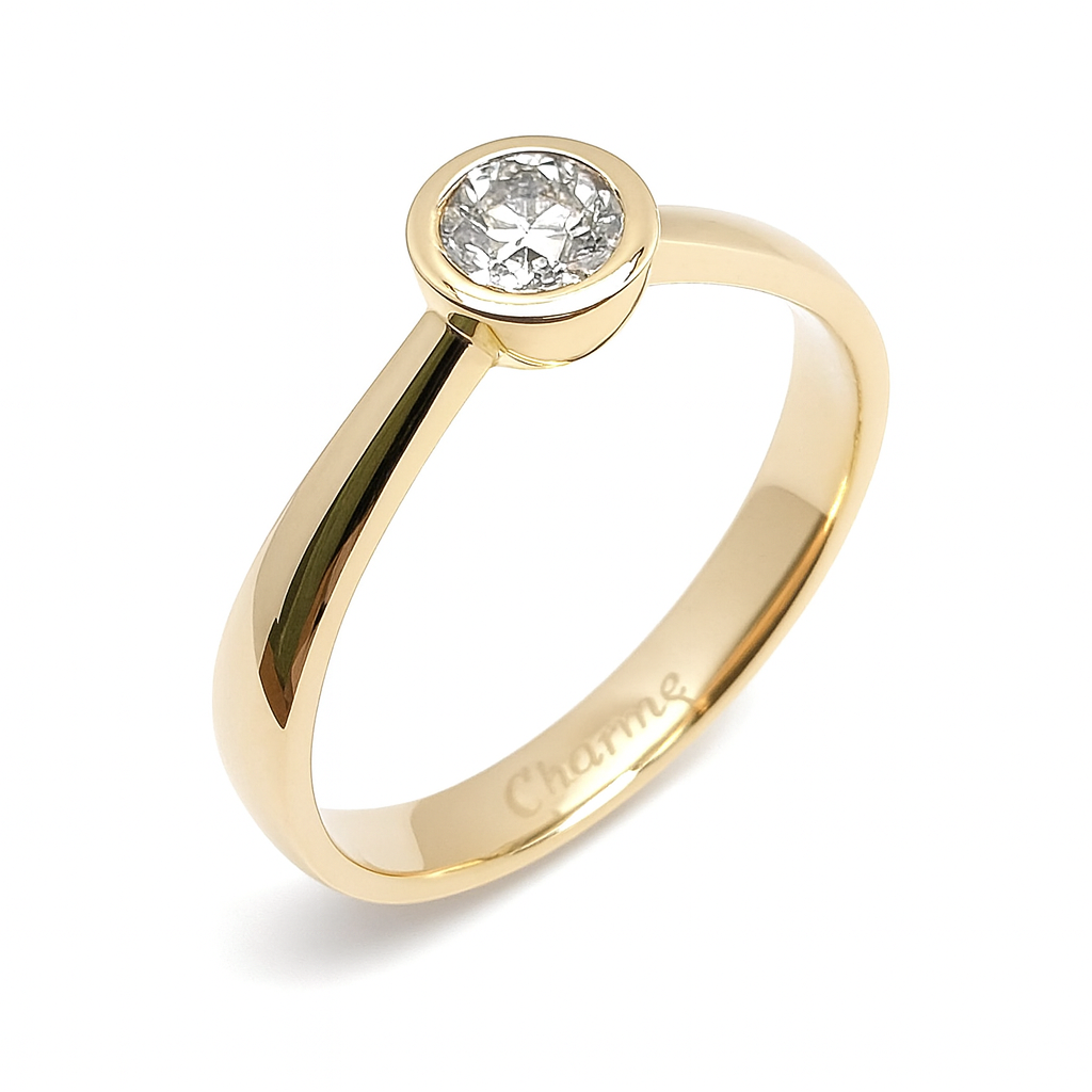 Alines klare Form und die schlichte Zargenfassung rücken den Diamanten in den Mittelpunkt. Die sanft geschwungene Ringschiene verleiht dem Design eine weiche Eleganz, die nie aus der Mode kommt.
